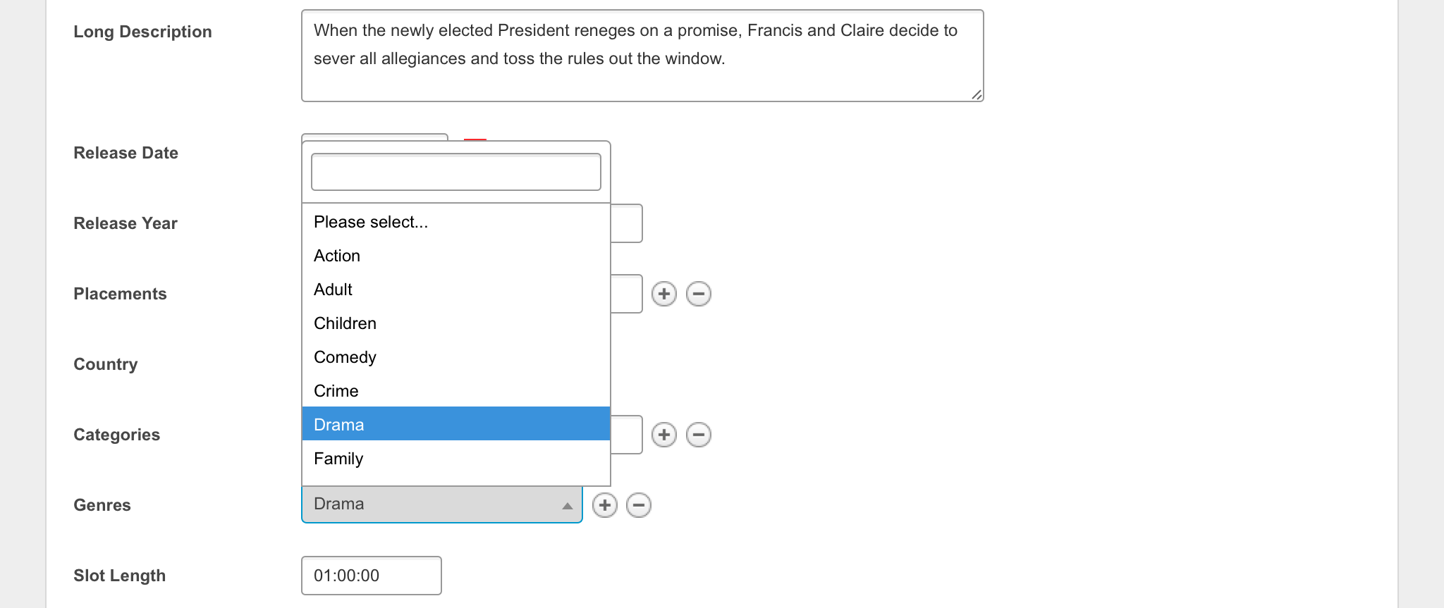 And fields can be configured to accept multiple values. For instance, you may need an”Actor” field, that can accept several names.